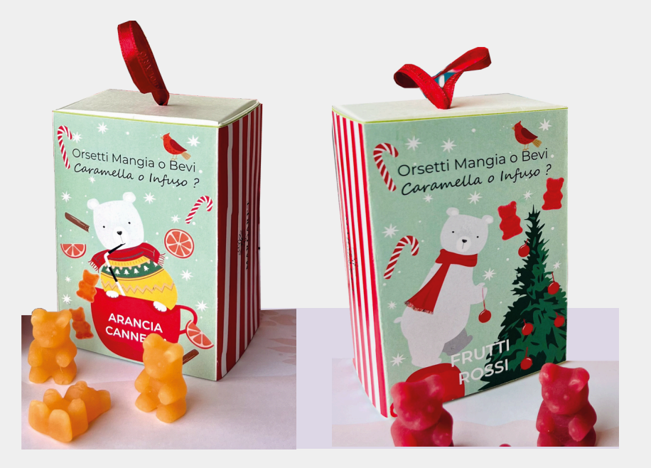 Confezioni contenente due scatoline con dei gustosi orsetti: una all’arancia e cannella e l’altra ai frutti rossi.